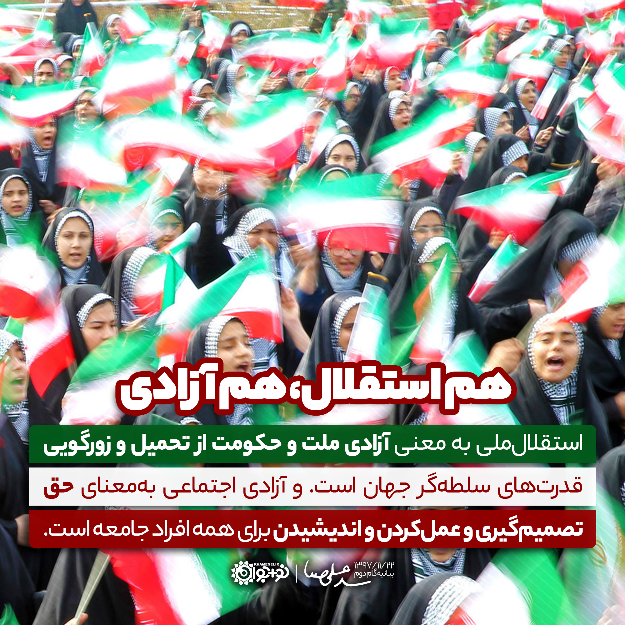 استقلال ملّی به معنی آزادی ملّت و حکومت از تحمیل و زورگویی قدرتهای سلطهگر جهان است. و آزادی اجتماعی بهمعنای حق تصمیمگیری و عمل کردن و اندیشیدن برای همه افراد جامعه است.