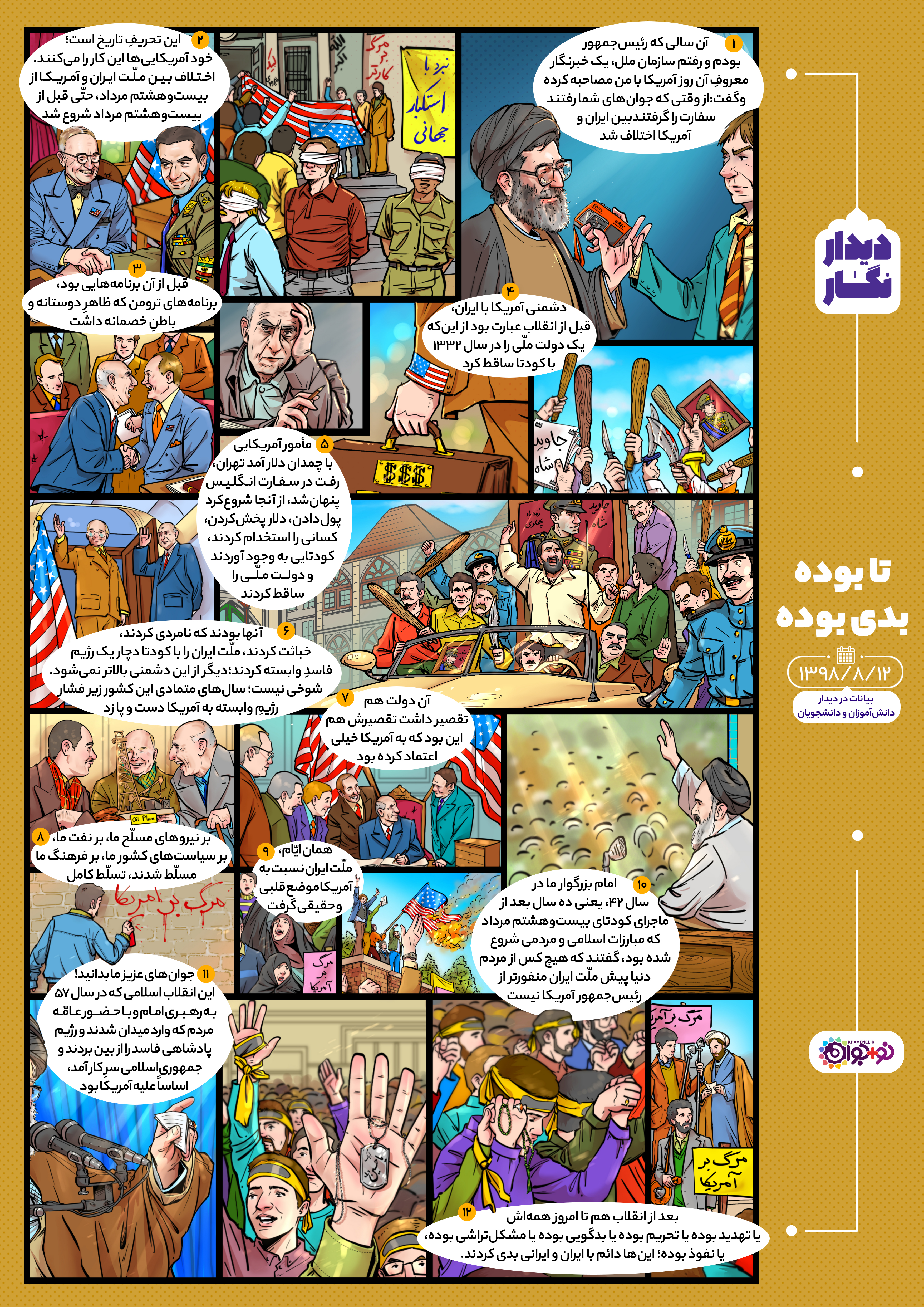 بعضیها تاریخ را تحریف میکنند؛ آن سالی که بنده رئیسجمهور بودم و رفتم سازمان ملل، یک خبرنگار معروفِ آن روزِ آمریکا، در سازمان ملل با بنده مصاحبه کرد و گفت: از وقتی که جوانهای شما رفتند سفارت را گرفتند، بین ایران و آمریکا اختلاف شد. این تحریفِ تاریخ است. اختلاف بین ملّت ایران و آمریکا از بیستوهشتم مرداد، حتّی قبل از بیستوهشتم مرداد شروع شد.