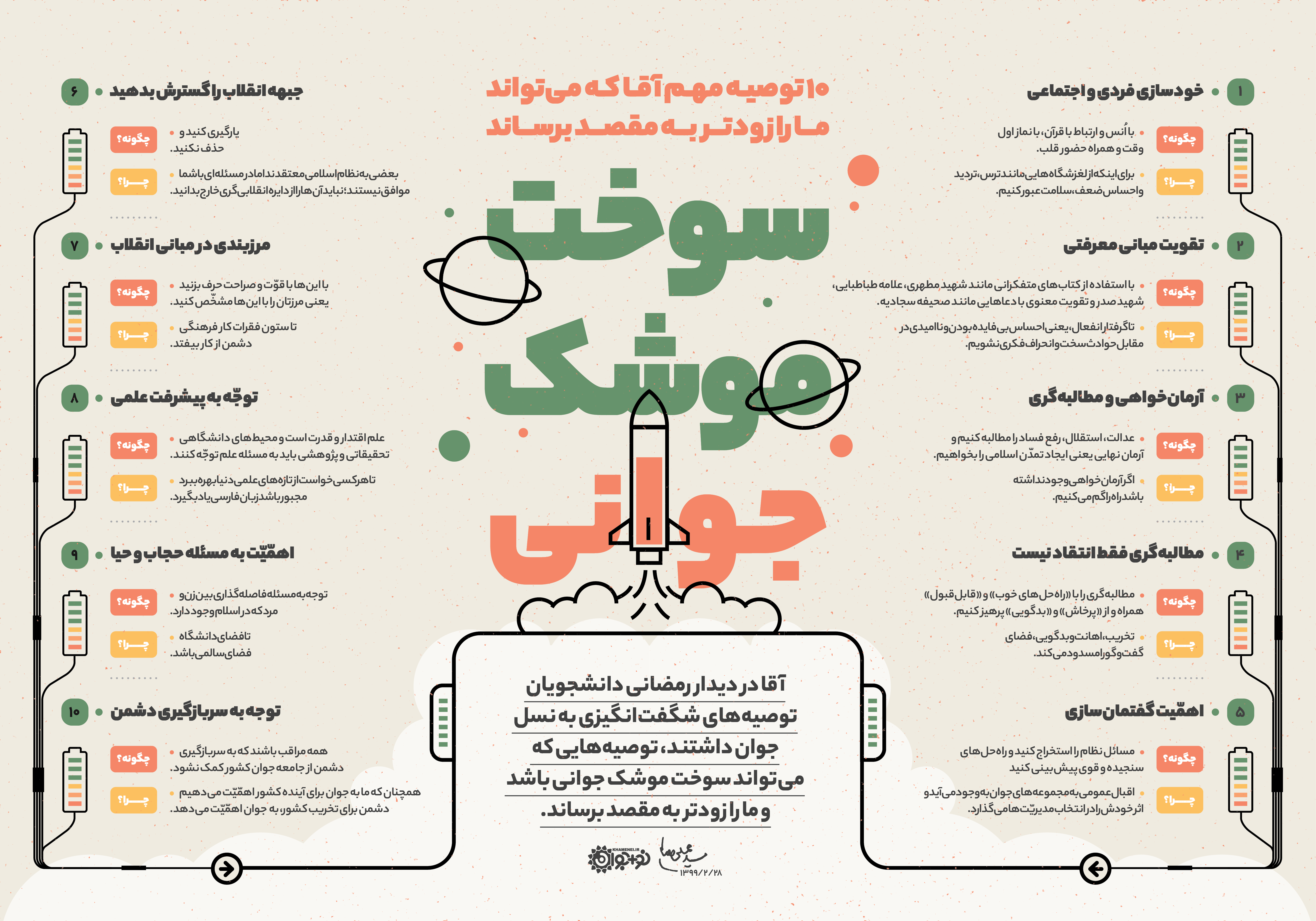آقا در دیدار رمضانی دانشجویان توصیههای شگفتانگیزی به نسل جوان داشتند، توصیههایی که میتواند سوخت موشک جوانی باشد و ما را زودتر به مقصد برساند.