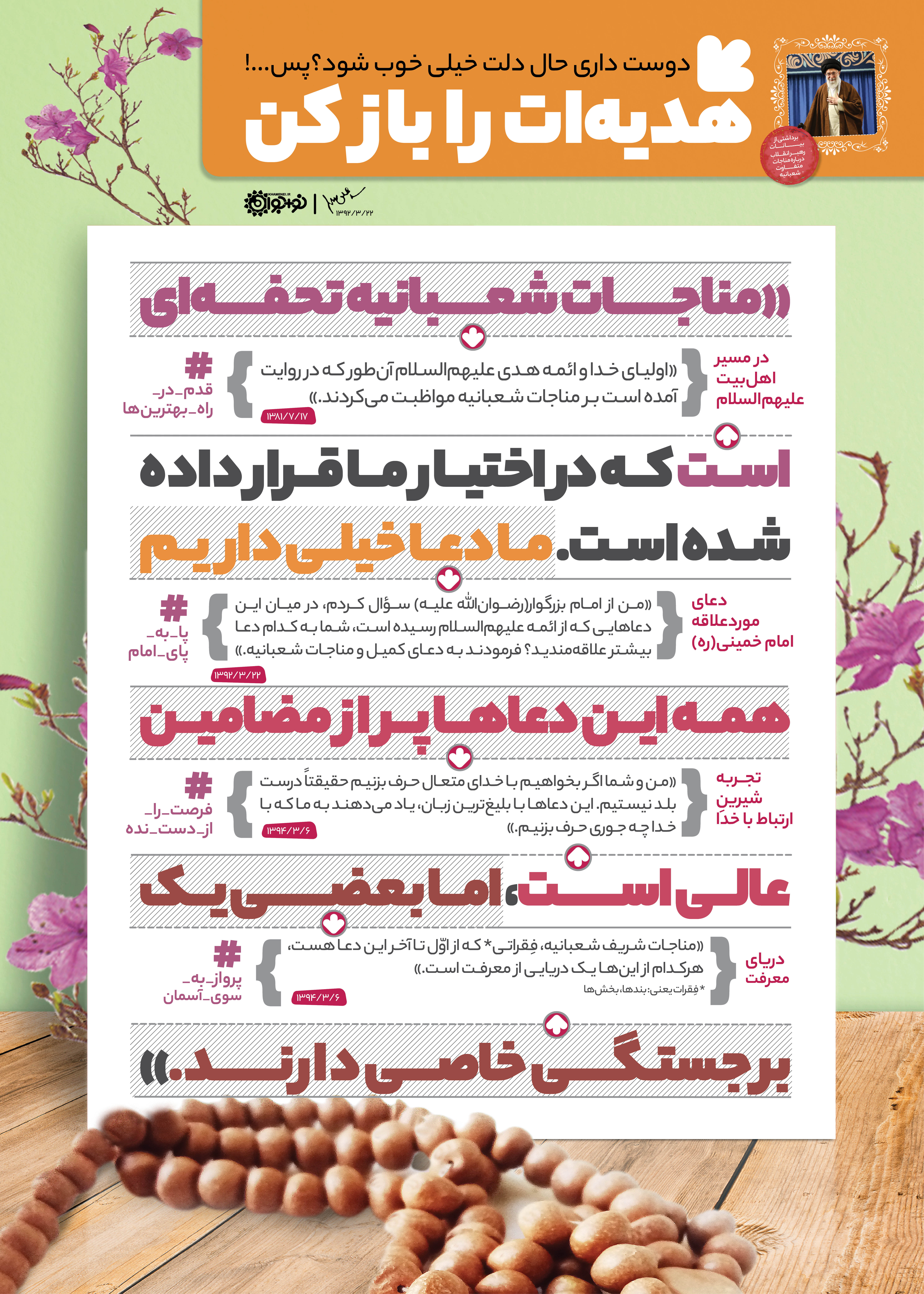مناجات شعبانیه تحفهای است كه در اختیار ما قرار داده شده است. ما دعا خیلی داریم، همه این دعاها پر از مضامین عالی است، اما بعضی یک برجستگی خاصی دارند.