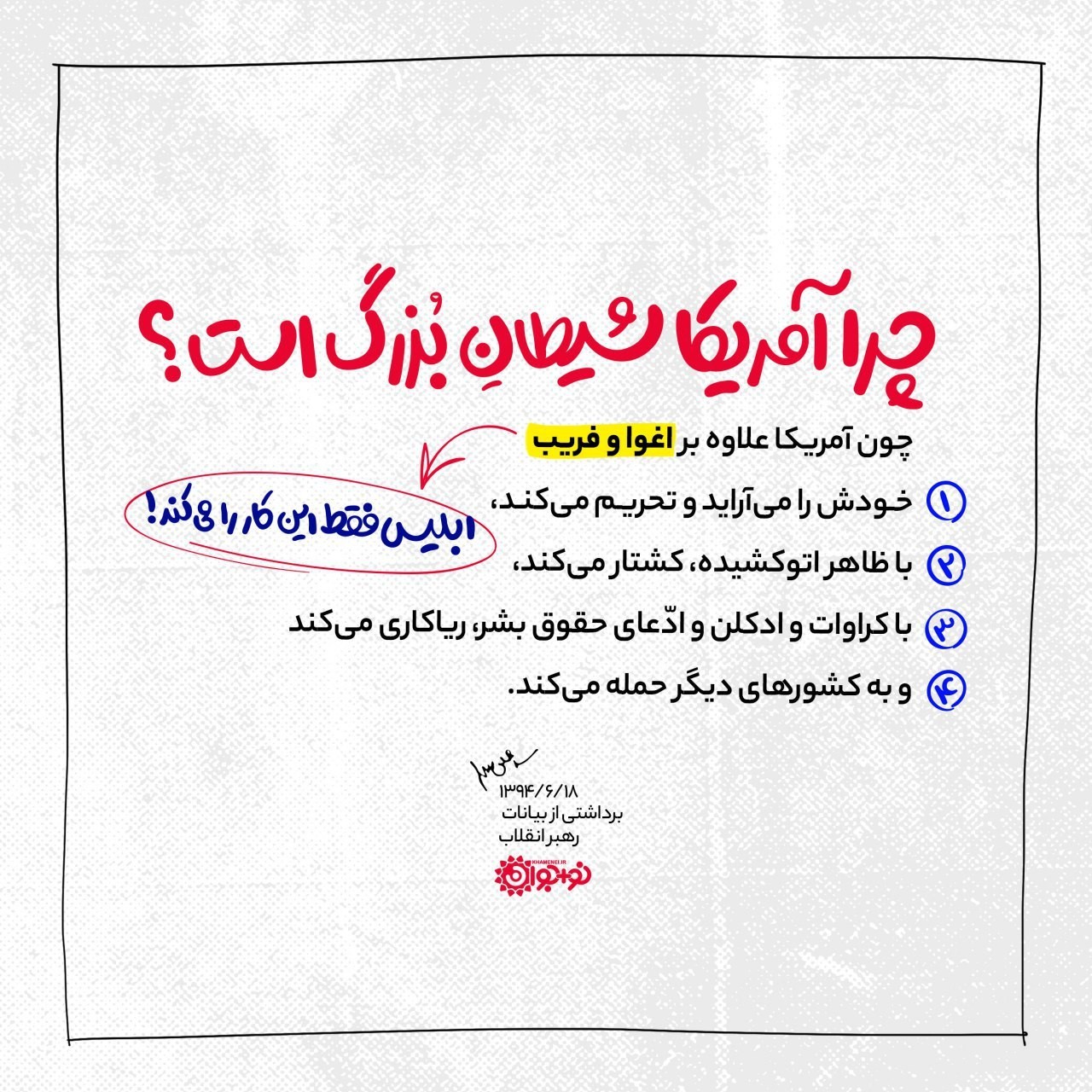 رئیس همه شیطانهای عالم، ابلیس است؛ امّا ابلیس، انسانها را اغواء میکند، فریب میدهد، وسوسه میکند؛ امّا آمریکا، هم اغواء میکند، هم کشتار میکند، هم تحریم میکند، هم فریب میدهد و هم ریاکاری میکند.