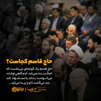 حاج قاسم یک گوشهای مینشست که اصلاً دیده نمیشد. آدم گاهی اوقات میخواست بداند یا استشهاد کند باید میگشت تا او را پیدا میکرد...