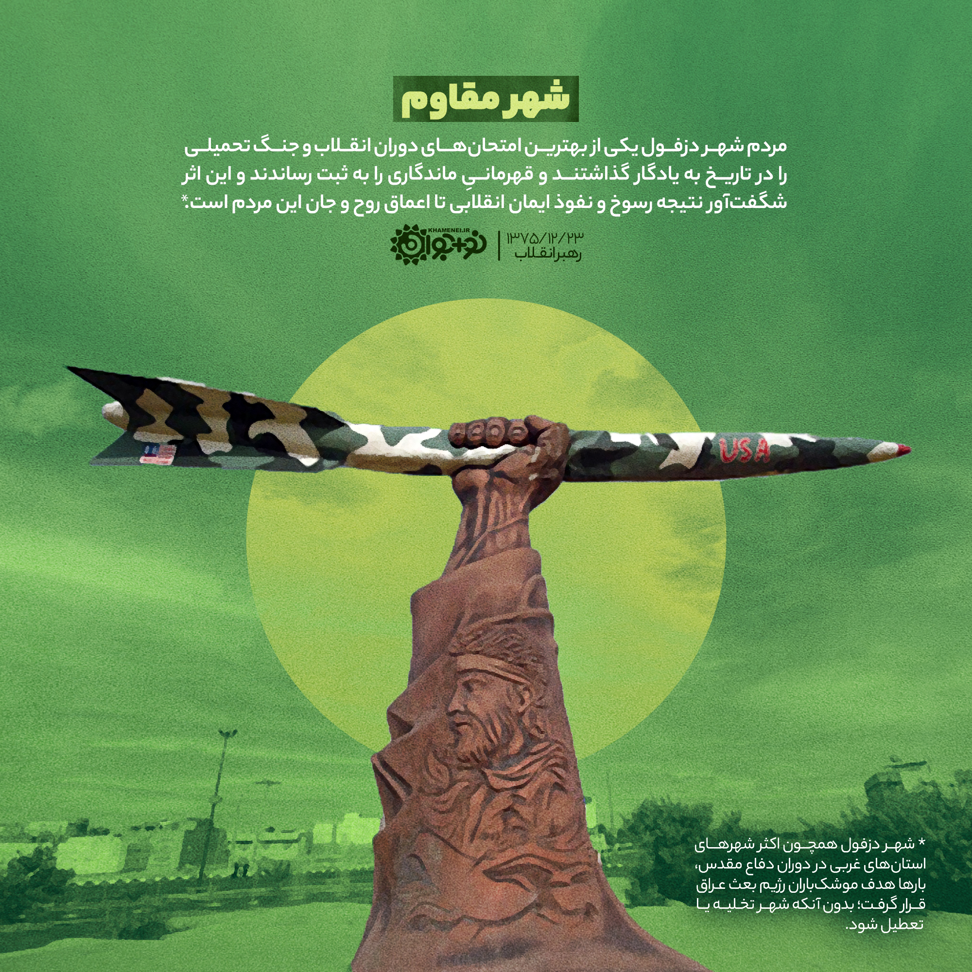 مردم شهر دزفول* یکی از بهترین امتحانهای دوران انقلاب و جنگ تحمیلی را در تاریخ به یادگار گذاشتند و قهرمانی ماندگاری را به ثبت رساندند و این اثر شگفتآور نتیجه رسوخ و نفوذ ایمان انقلابی تا اعماق روح و جان این مردم است.