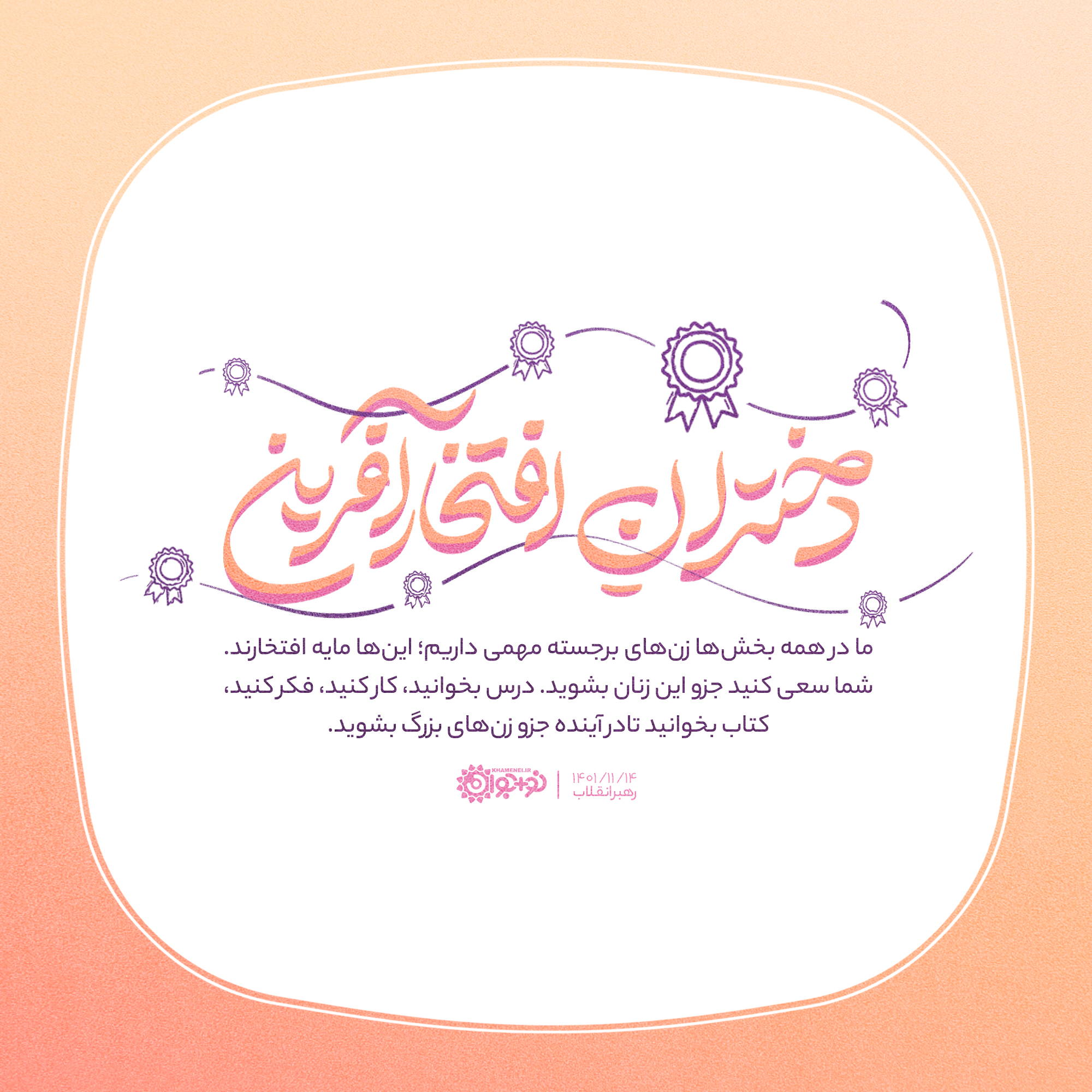 ما در همه بخشها زنهای برجسته مهمی داریم؛ اینها مایه افتخارند. شما سعی کنید جزو این زنان بشوید. درس بخوانید، کار کنید، فکر کنید، کتاب بخوانید تا در آینده جزو زنهای بزرگ بشوید.