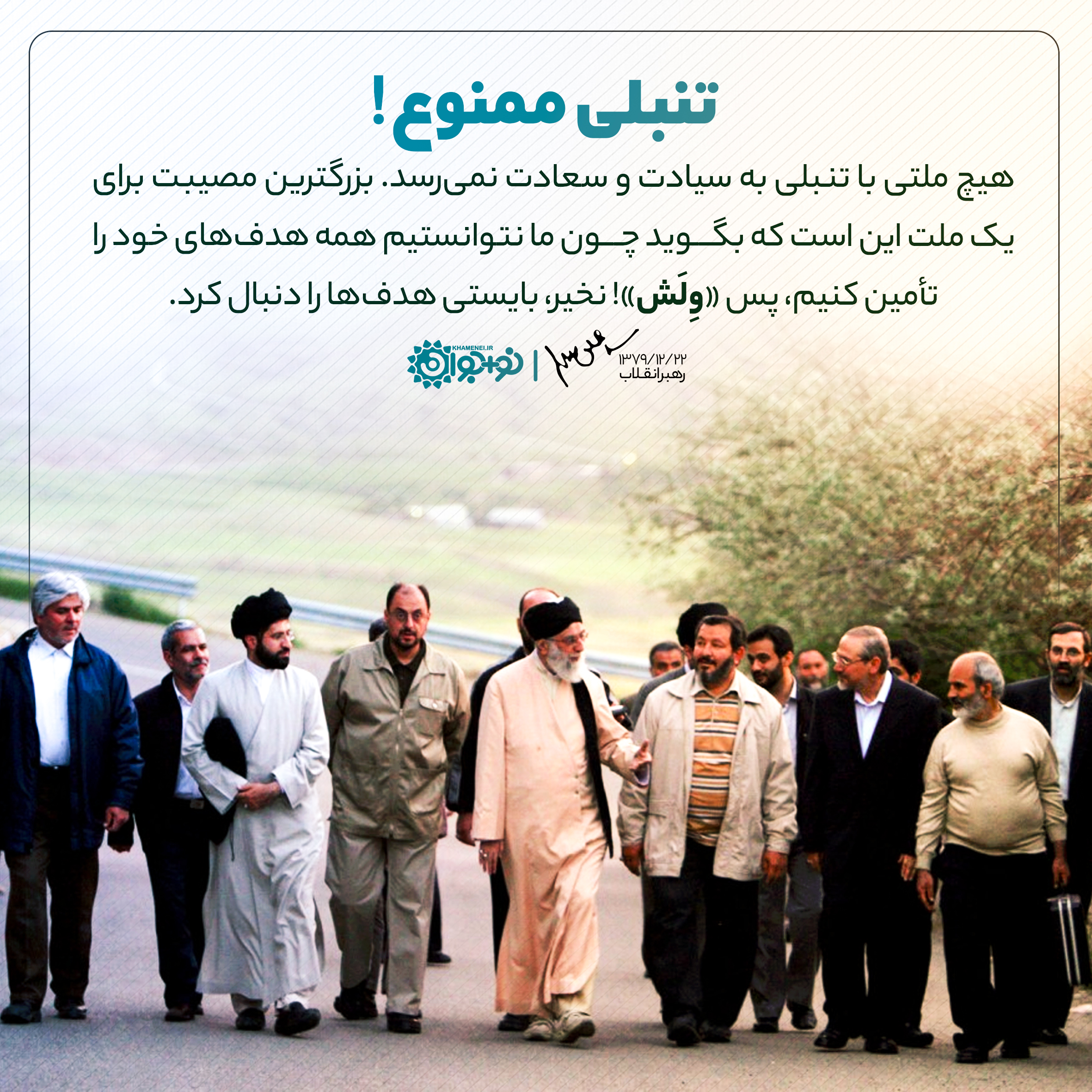 هیچ ملتی با تنبلی به سیادت و سعادت نمیرسد. بزرگترین مصیبت برای یک ملت این است که بگوید چون ما نتوانستیم همه هدفهای خود را تأمین کنیم، پس «وِلَش»! نخیر؛ بایستی هدفها را دنبال کرد.