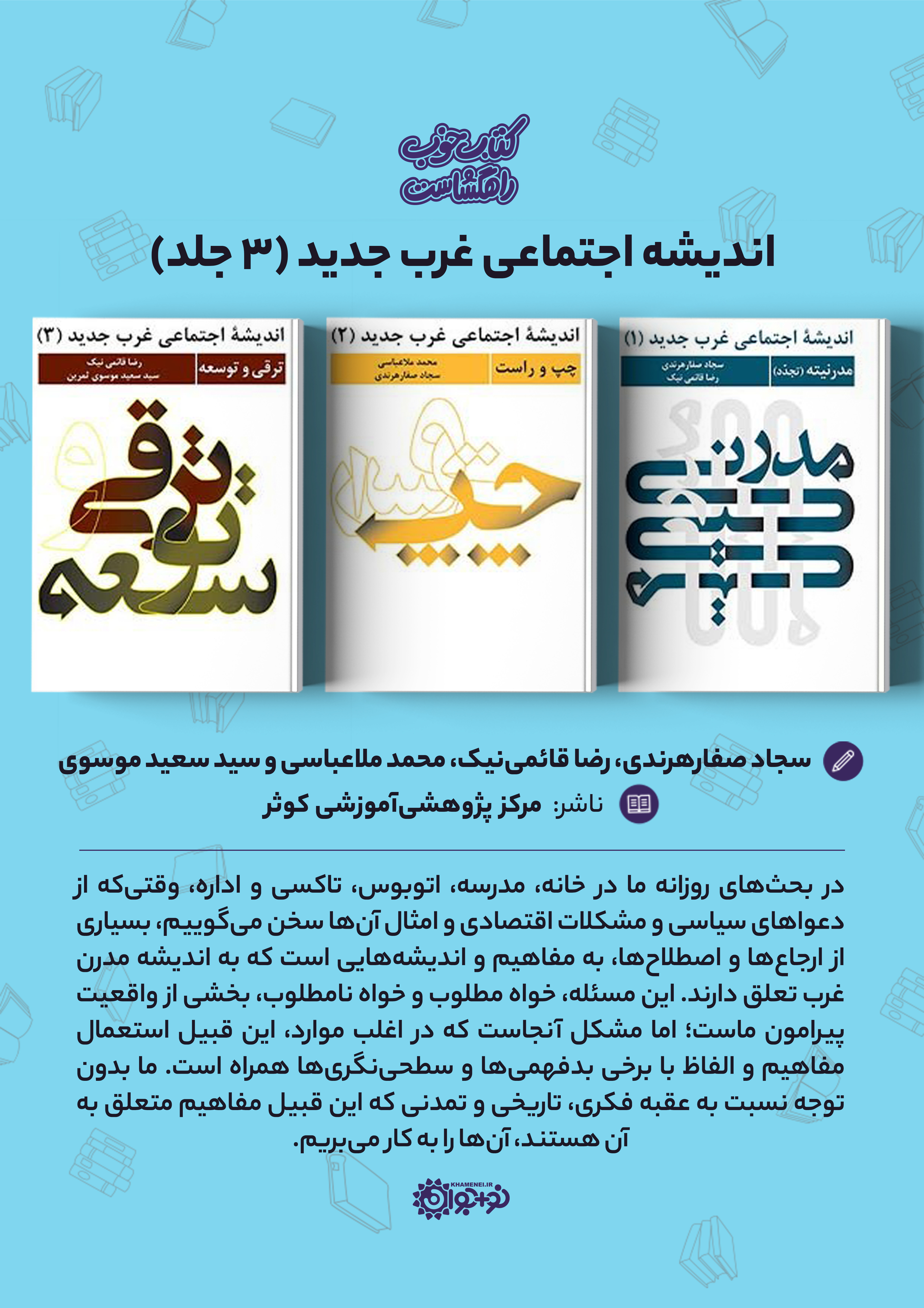 در بحثهای روزانه ما در خانه، مدرسه، اتوبوس، تاکسی و اداره، وقتی که از دعواهای سیاسی و مشکلات اقتصادی و امثال آنها سخن میگوییم، بسیاری از ارجاعها و اصطلاحها، به مفاهیم و اندیشههایی است که به انديشه مدرن غرب تعلق دارند. این مسئله، خواه مطلوب و خواه نامطلوب، بخشی از واقعیت پیرامون ماست؛ اما مشکل آنجاست که در اغلب موارد، این قبیل استعمال مفاهیم و الفاظ با برخی بدفهمیها و سطحینگریها همراه است. ما بدون توجه نسبت به عقبه فکری، تاریخی و تمدنی که این قبیل مفاهیم متعلق به آن هستند، آنها را به کار میبریم. مجموعه «اندیشه اجتماعی غرب جدید»، محتوایی جمعوجور درباره عقبه فکری، تاریخی و تمدنی بسیاری از مفاهیم و مطالبی است که ریشه در غرب دارند.