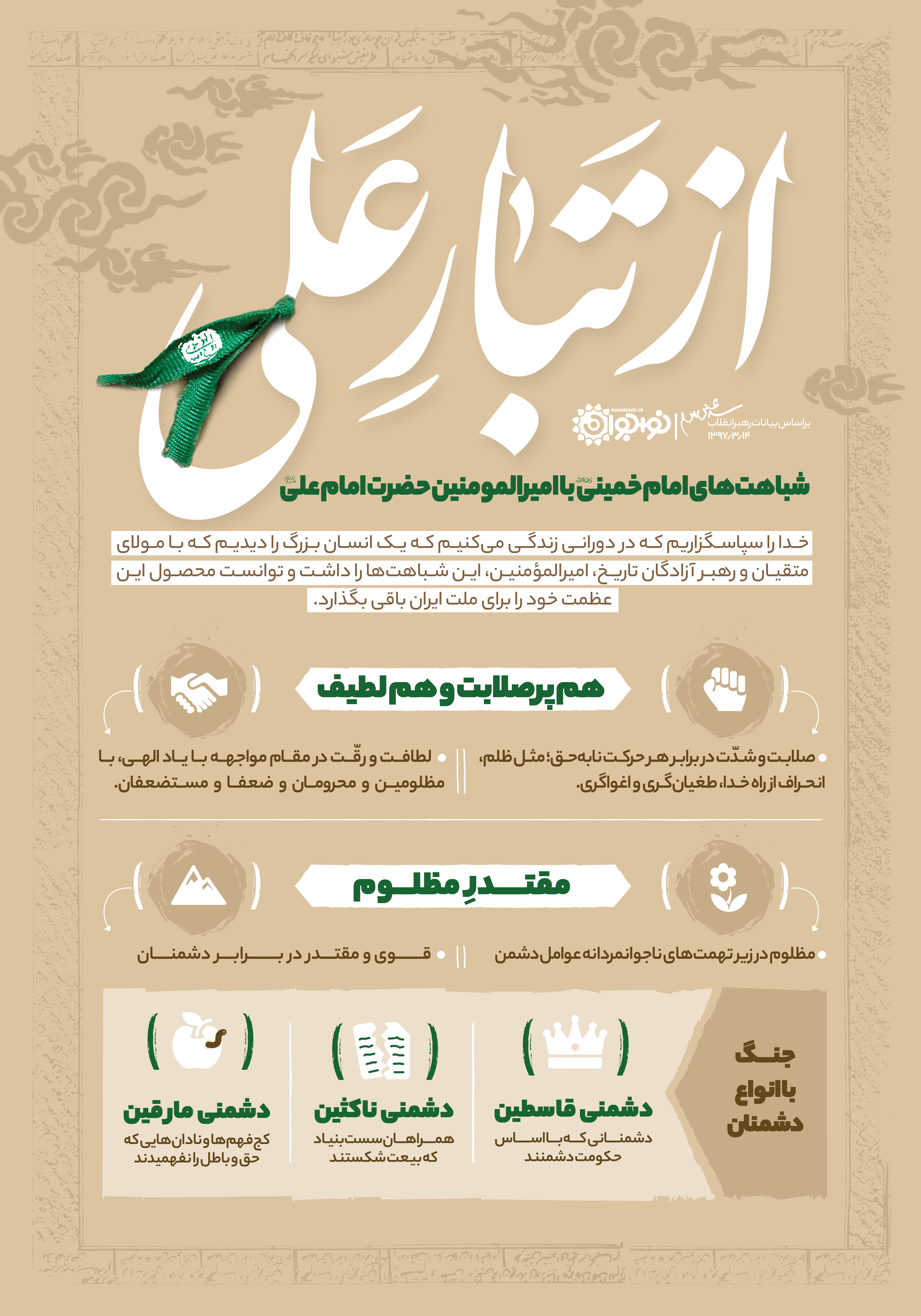 خدا را سپاسگزاریم که در دورانی زندگی میکنیم که یک انسان بزرگی را دیدیم که با مولای متّقیان و رهبر آزادگان تاریخ، امیرالمؤمنین، این شباهتها را داشت و توانست محصولِ این عظمتِ خود را برای ملّت ایران باقی بگذارد.