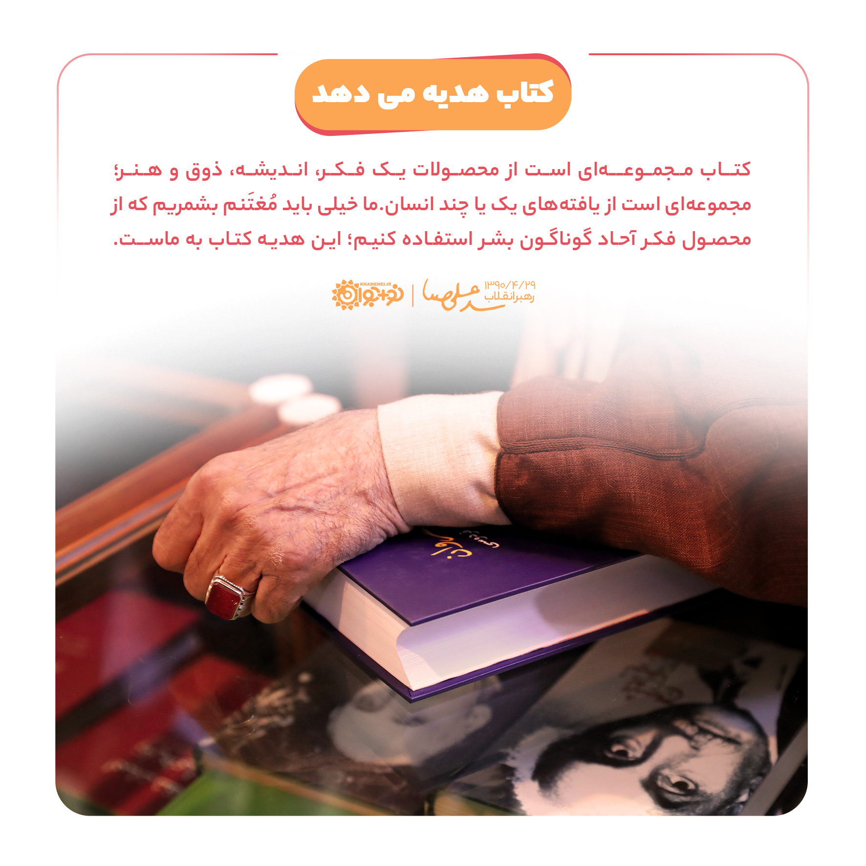 کتاب مجموعهای است از محصولات یک فکر، اندیشه، ذوق و هنر؛ مجموعهای است از یافتههای یک یا چند انسان. ما خیلی باید مُغتَنم بشمریم که از محصول فکر آحاد گوناگون بشر استفاده کنیم؛ این هدیه کتاب به ماست.