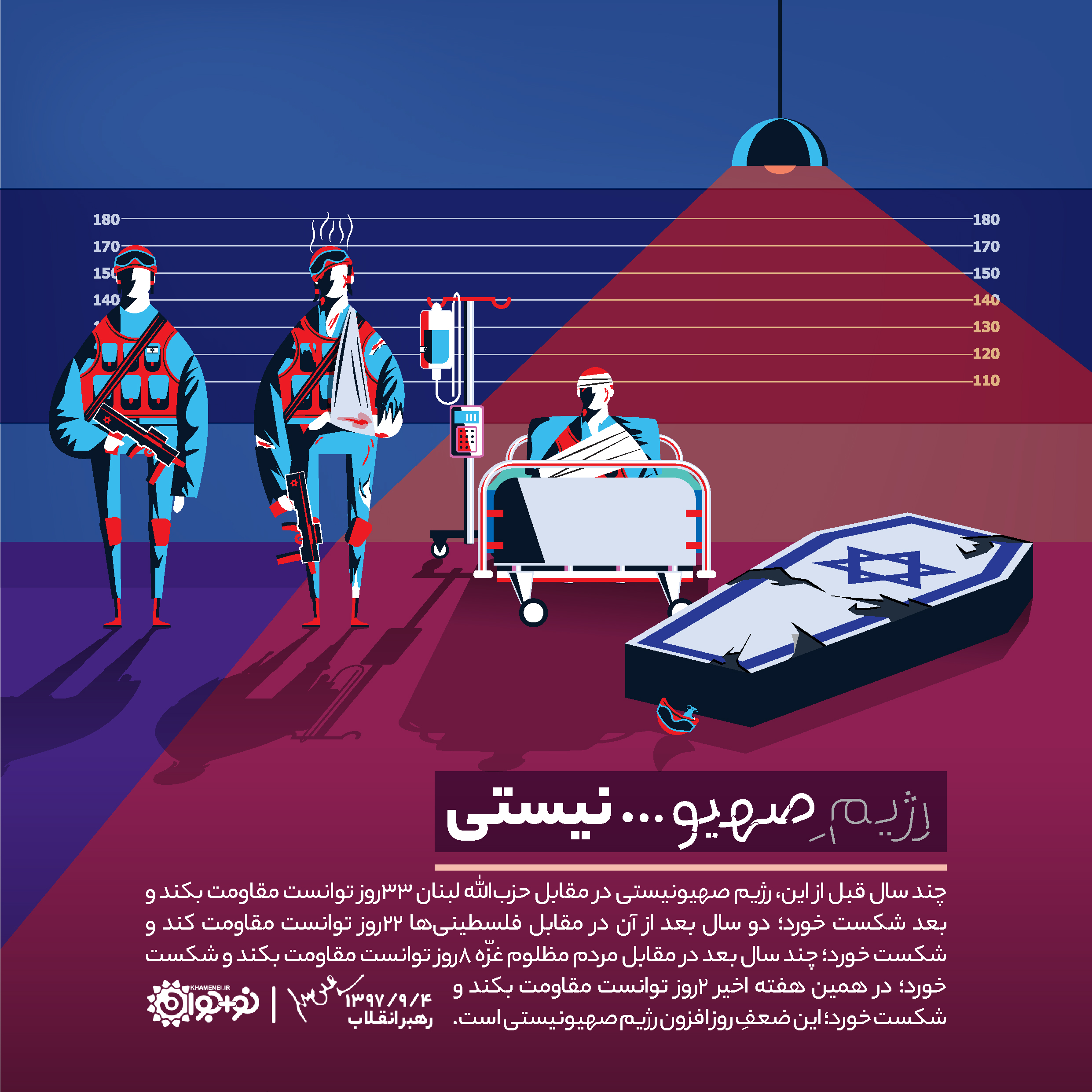 چند سال قبل از این، رژیم صهیونیستی در مقابل حزبالله لبنان شکست خورد؛ ۳۳ روز توانست مقاومت بکند و بعد شکست خورد؛ دو سال بعد از آن در مقابل فلسطینیها ۲۲ روز توانست مقاومت کند و شکست خورد؛ چند سال بعد در مقابل مردم مظلوم غزّه ۸ روز توانست مقاومت بکند و شکست خورد؛ در همین هفته اخیر ۲ روز توانست مقاومت بکند و شکست خورد؛ این ضعفِ روزافزون رژیم صهیونیستی است.