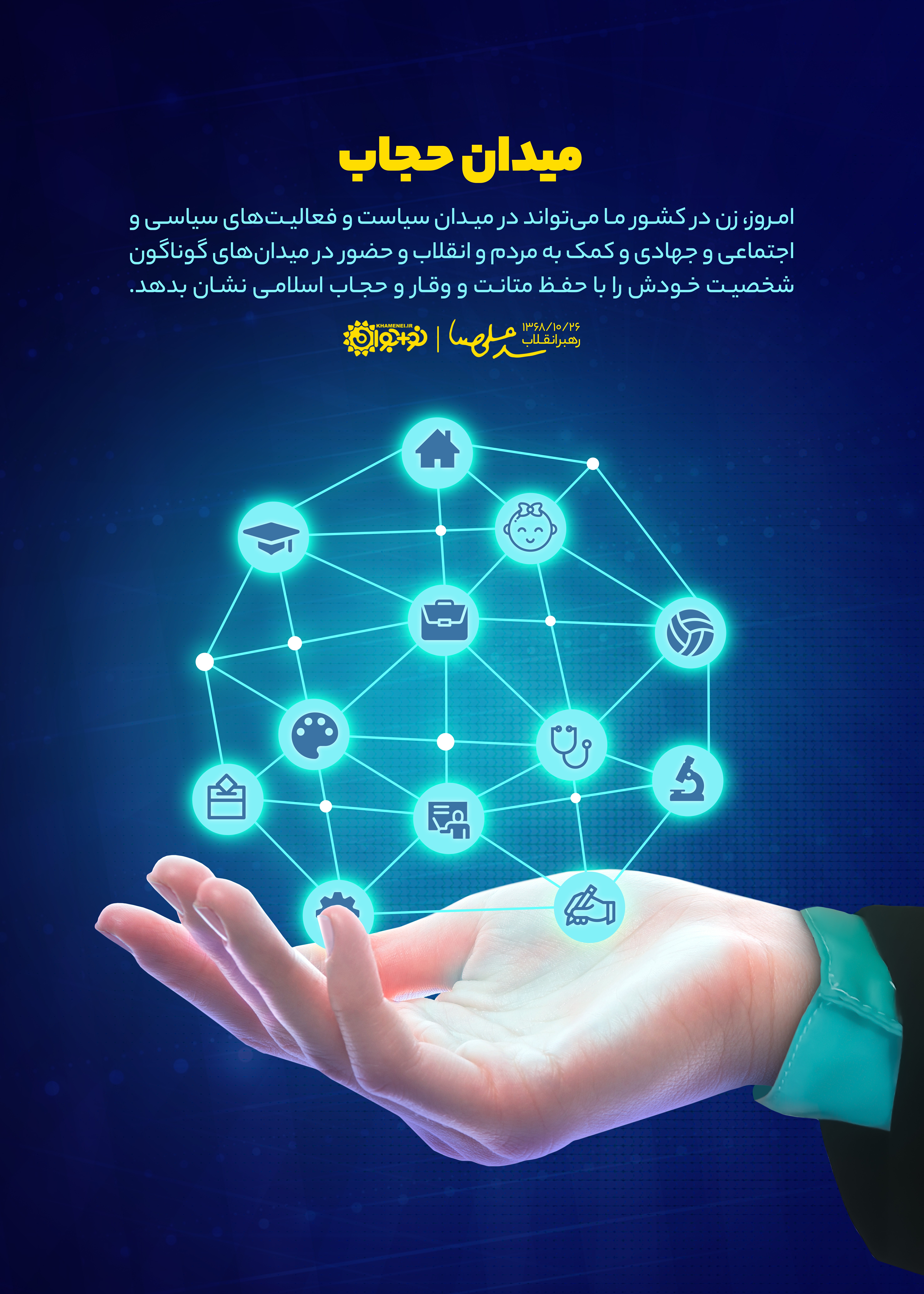 امروز، زن در کشور ما میتواند در میدان سیاست و فعالیتهای سیاسی و اجتماعی و جهادی و کمک به مردم و انقلاب و حضور در میدانهای گوناگون، شخصیت خودش را با حفظ متانت و وقار و حجاب اسلامی نشان بدهد.