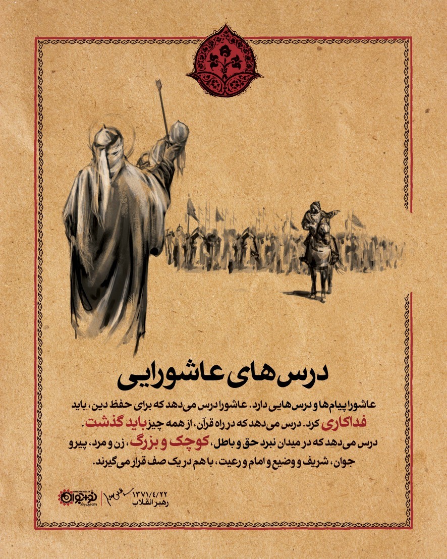 عاشورا پیامها و درسهایی دارد. عاشورا درس میدهد که برای حفظ دین، باید فداکاری کرد. درس میدهد که در راه قرآن، از همه چیز باید گذشت. درس میدهد که در میدان نبرد حقّ و باطل، کوچک و بزرگ، زن و مرد، پیر و جوان، شریف و وضیع و امام و رعیّت، با هم در یک صف قرار میگیرند.