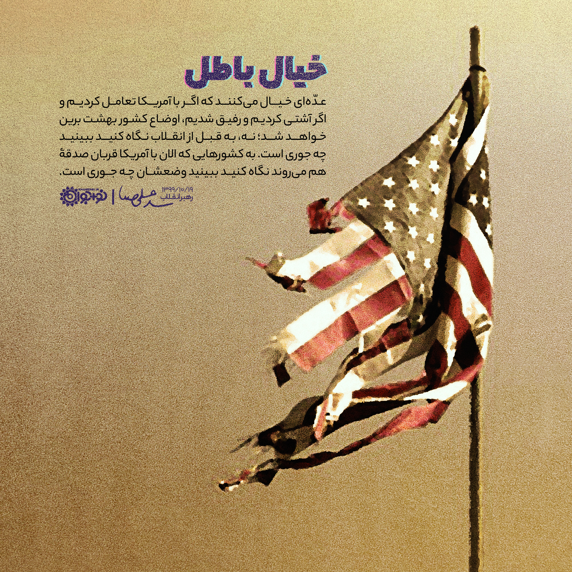 عـدّهای خیال میکنند که اگر با آمریکا تعامل کردیم و اگر آشتی کردیم و رفیق شدیم، اوضاع کشور بهشت برین خواهد شد؛ نه، به قبل از انقلاب نگاه کنید ببینید چه جوری است. به کشورهایی که الان با آمریکا قربان صدقه هم میروند نگاه کنید ببینید وضعشان چه جوری است.