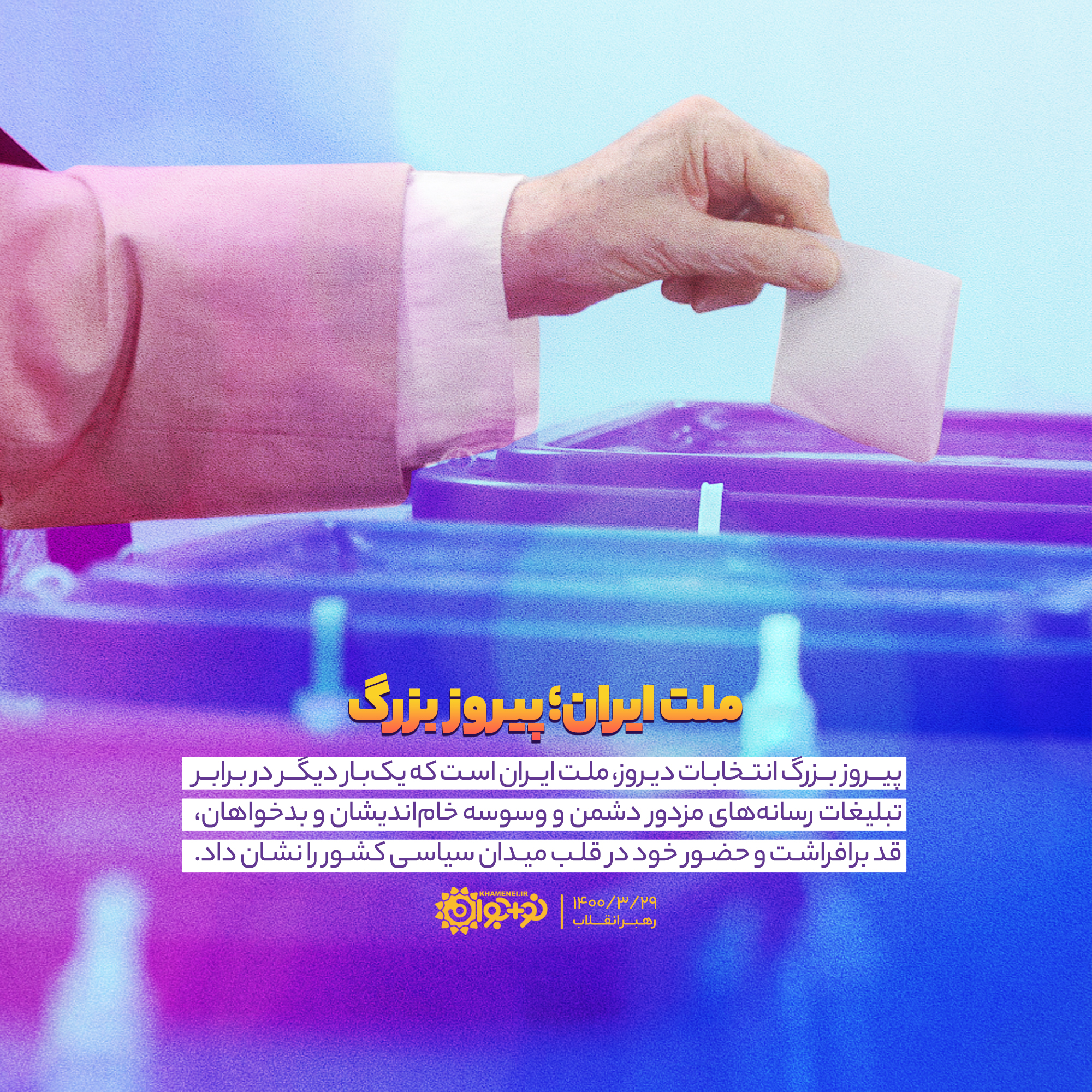 پیروز بزرگ انتخابات دیروز، ملت ایران است که یکبار دیگر در برابر تبلیغات رسانههای مزدور دشمن و وسوسه خاماندیشان و بدخواهان، قد برافراشت و حضور خود در قلب میدان سیاسی کشور را نشان داد.