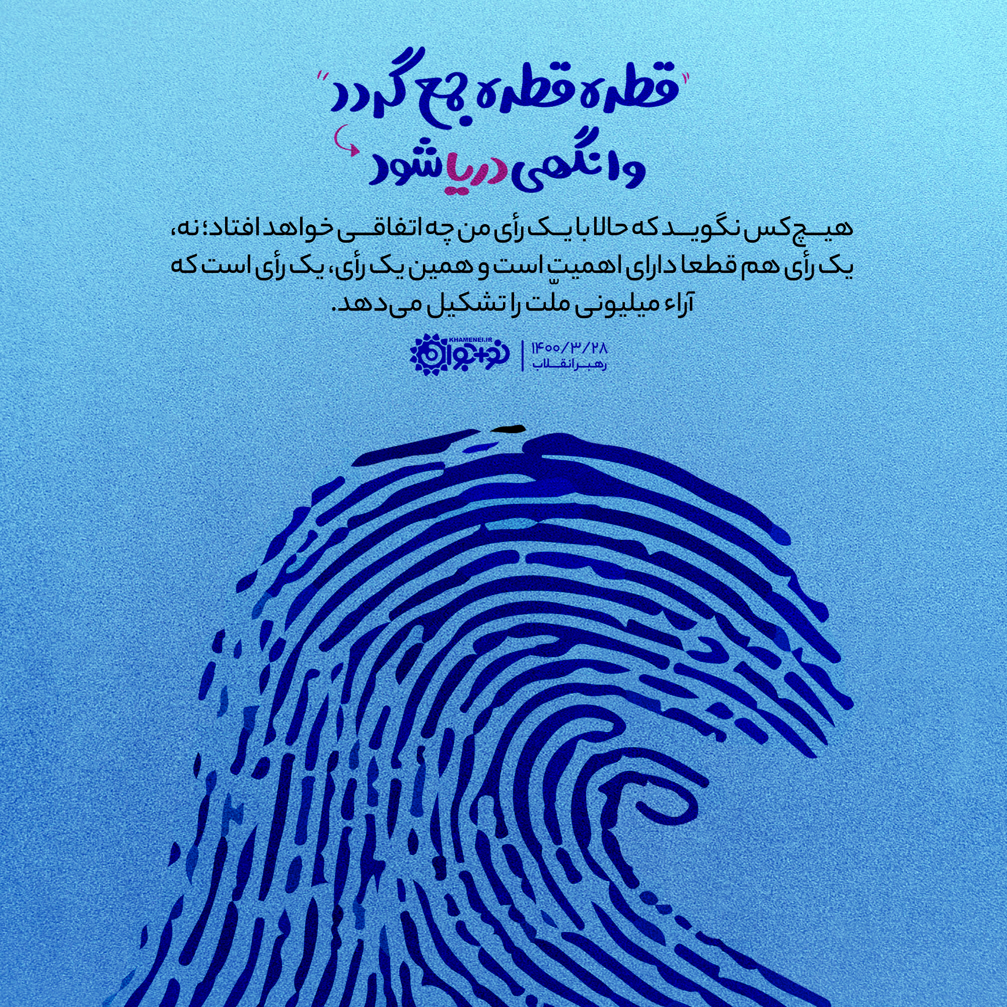 هیچکس نگوید که حالا با یک رأی من چه اتّفاقی خواهد افتاد؛ نه، یک رأی هم قطعاً دارای اهمّیّت است و همین یک رأی، یک رأی است که آراء میلیونی ملّت را تشکیل میدهد.