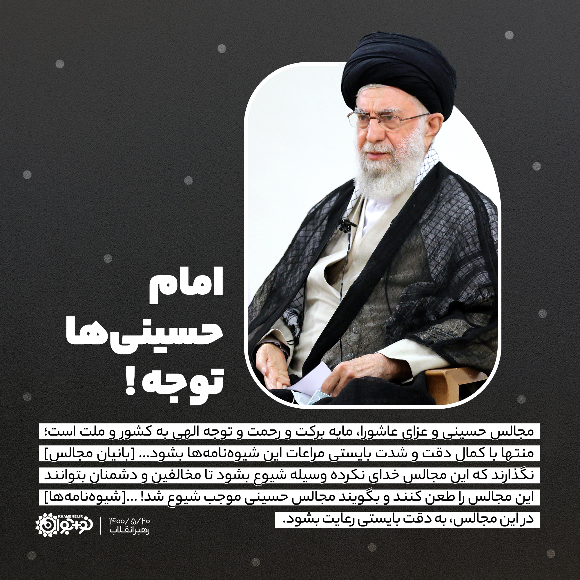 مجالس حسینی و مجالس عزای عاشورا مایه برکت، رحمت و توجّه الهی به کشور و ملّت است؛ ما به این مجالس احتیاج داریم، منتها با کمال دقت و شدّت بایستی این شیوهنامهها مراعات بشود ... [بانیان مجالس] نگذارند که این مجالس خداینکرده وسیله شیوع بشود تا مخالفین و دشمنان بتوانند این مجالس را طعن کنند و بگویند مجالس حسینی موجب شیوع شد. [شیوهنامهها] در این مجالس بهدقّت بایستی رعایت بشود.