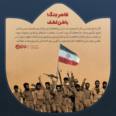 اگر هشت سال دفاع مقدّس با آن خصوصیّات در این قطعه از تاریخ کشور ما وجود نمیداشت، امروز کشور ما و ملّت ما مطمئنّاً نه از عزّت، نه از امنیّت، نه از سلامت، نه از استقلال و نه از آزادی برخوردار نبود. آن هشت سال [که] بهظاهر جنگ و فشار و ترس و هول و مشکلات فراوان [بود]، در باطن خود یک نعمت الهی بود؛ یکی از الطاف خفیّه الهی بود که به این کشور و این ملّت عطا شد.
