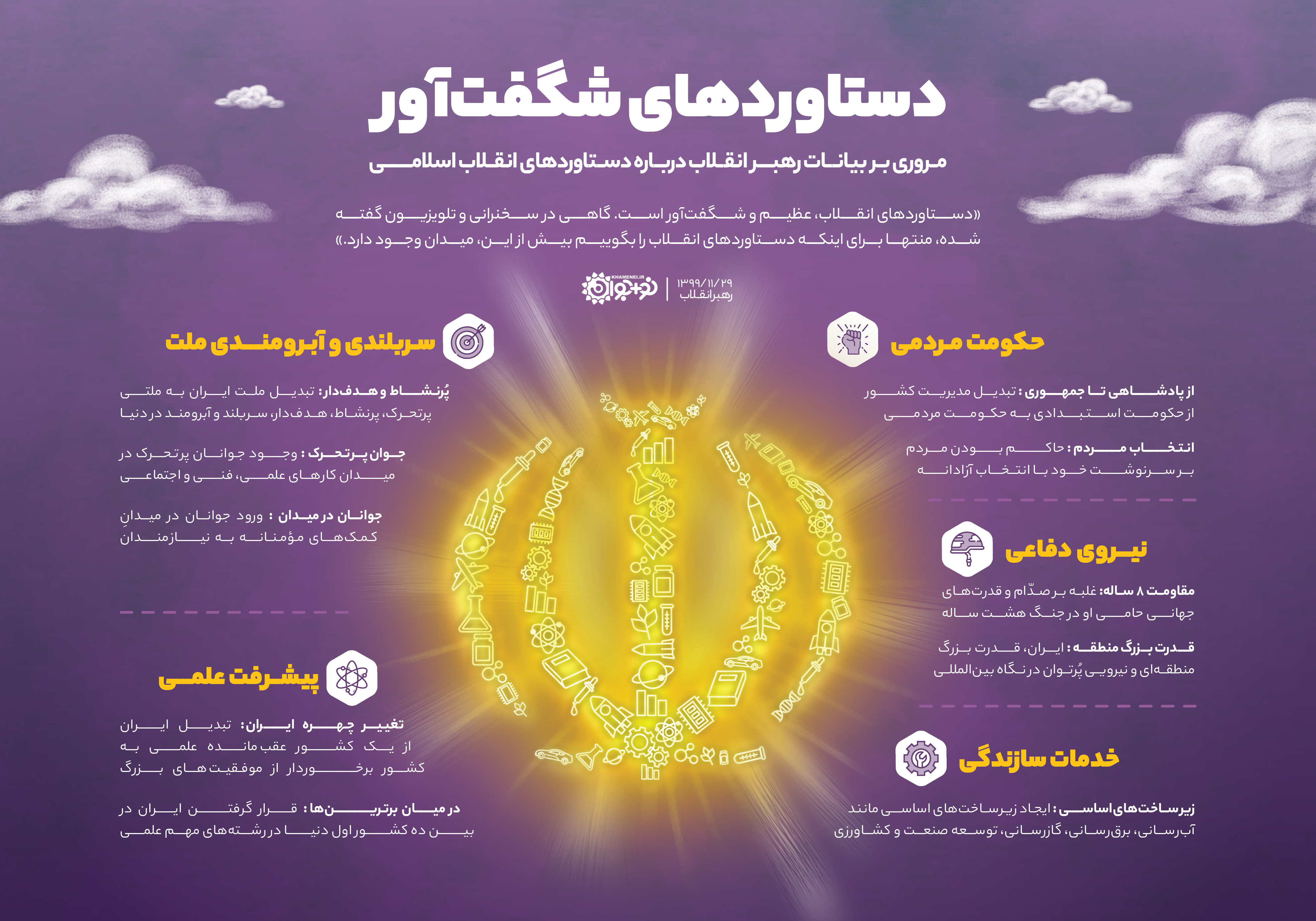 دستاوردهای انقلاب، عظیم و شگفتآور است. گاهی در سخنرانی و تلویزیون گفتهشده، منتها برای اینکه دستاوردهای انقلاب را بگوییم بیش از این، میدان وجود دارد.