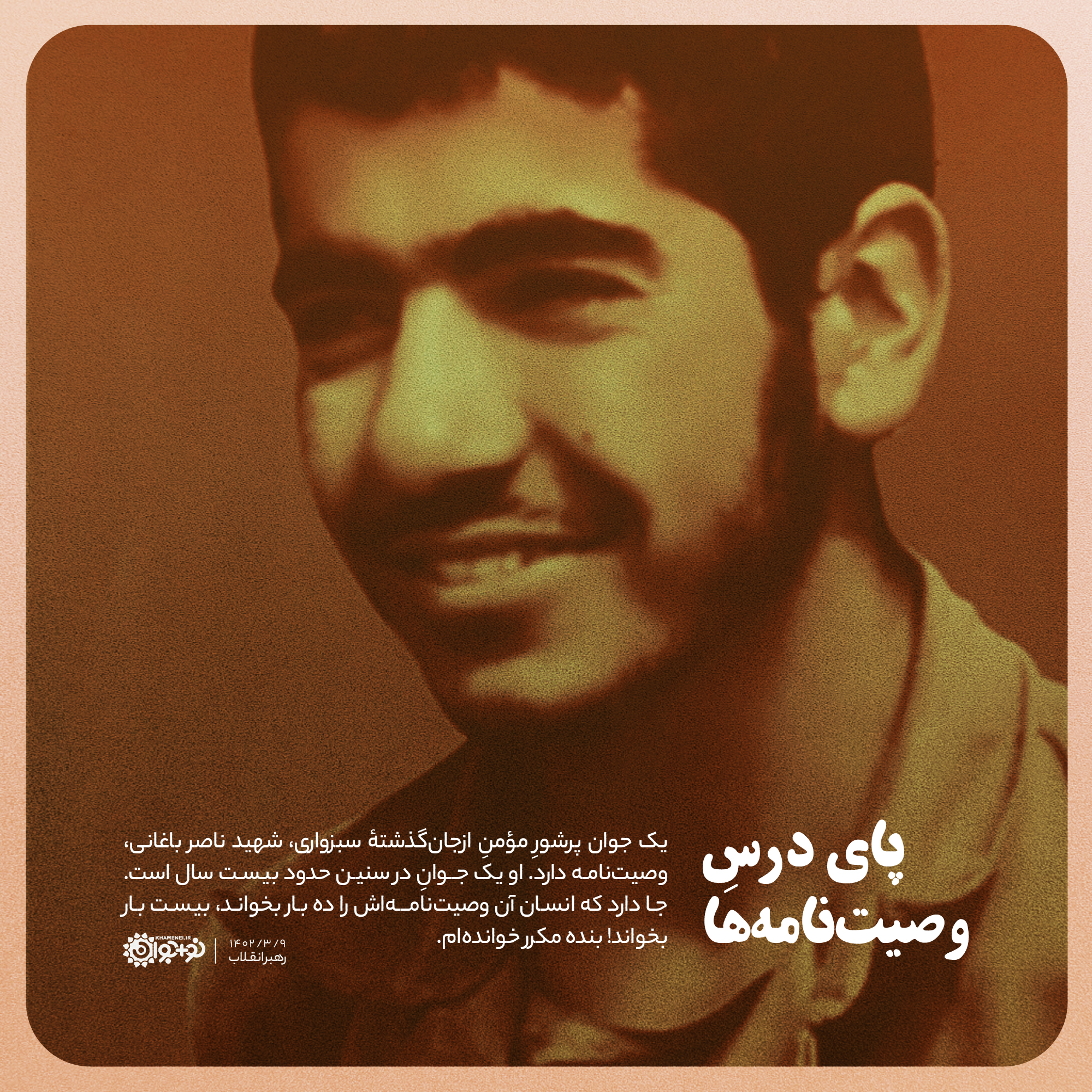 یک جوانِ پُرشورِ مؤمنِ ازجانگذشته سبزواری، شهید ناصر باغانی، وصیتنامه دارد. او یک جوانِ در سنین حدود بیست سال است. جا دارد که انسان آن وصیتنامهاش را ده بار بخواند، بیست بار بخواند! بنده مکرر خواندهام.