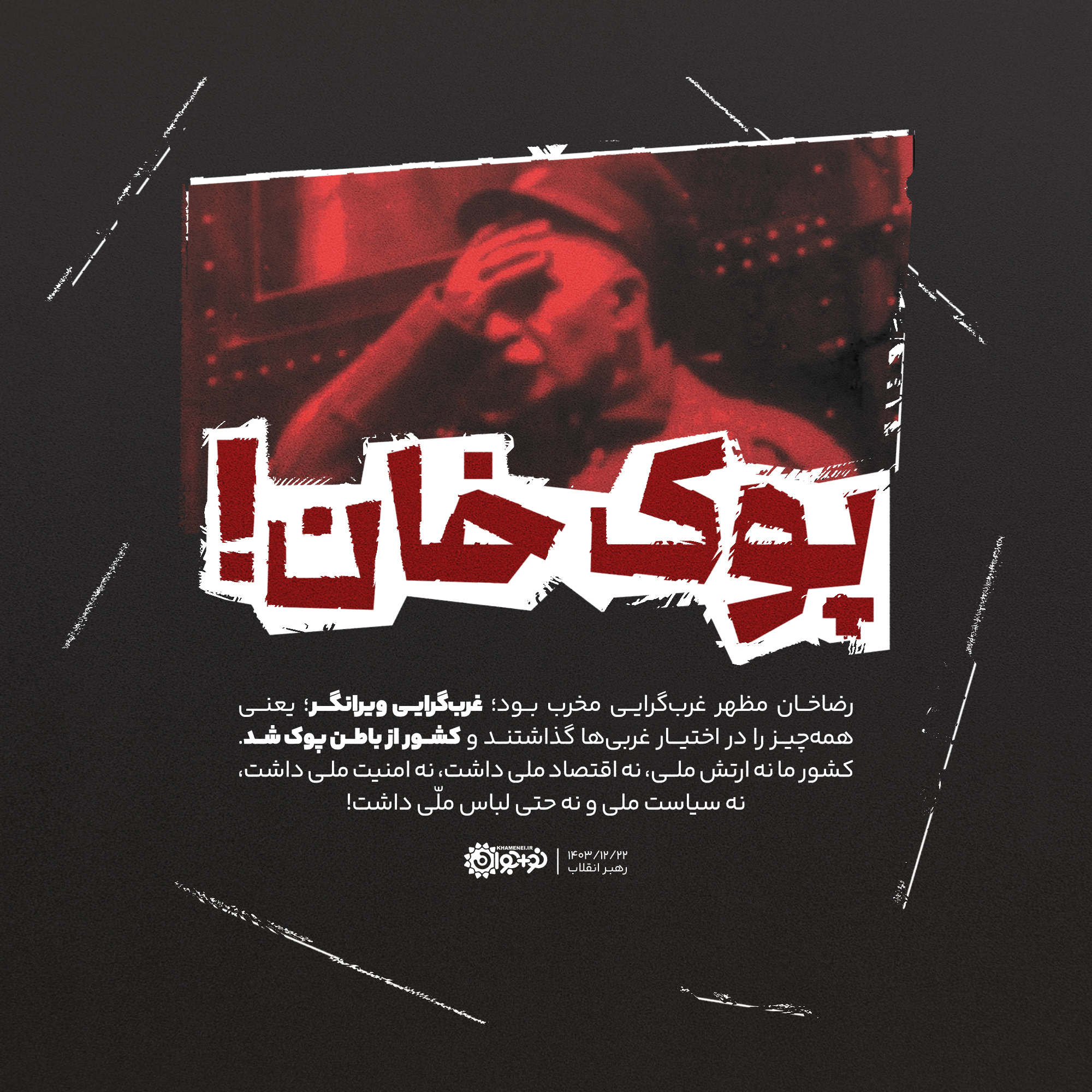 رضاخان مظهر غربگرایی مخرب بود؛ غربگرایی ویرانگر؛ یعنی همهچیز را در اختیار غربیها گذاشتند و کشور از باطن پوک شد. کشور ما نه ارتش ملی، نه اقتصاد ملی داشت، نه امنیت ملی داشت، نه سیاست ملی و نه حتی لباس ملی داشت!